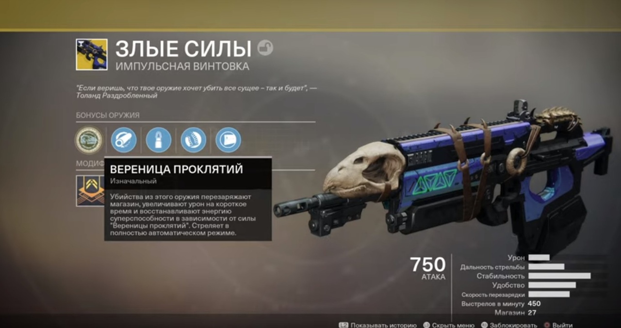В игре Destiny 2 существуют разные виды оружия. Если выполнить определённые квесты, то можно разблокировать уникальное оружие – винтовку «Злые силы». Эта винтовка любима фанатами игры, т.к. обладает отличной способностью «Вереница проклятий», а с помощью Катализатора делает её ещё мощнее.